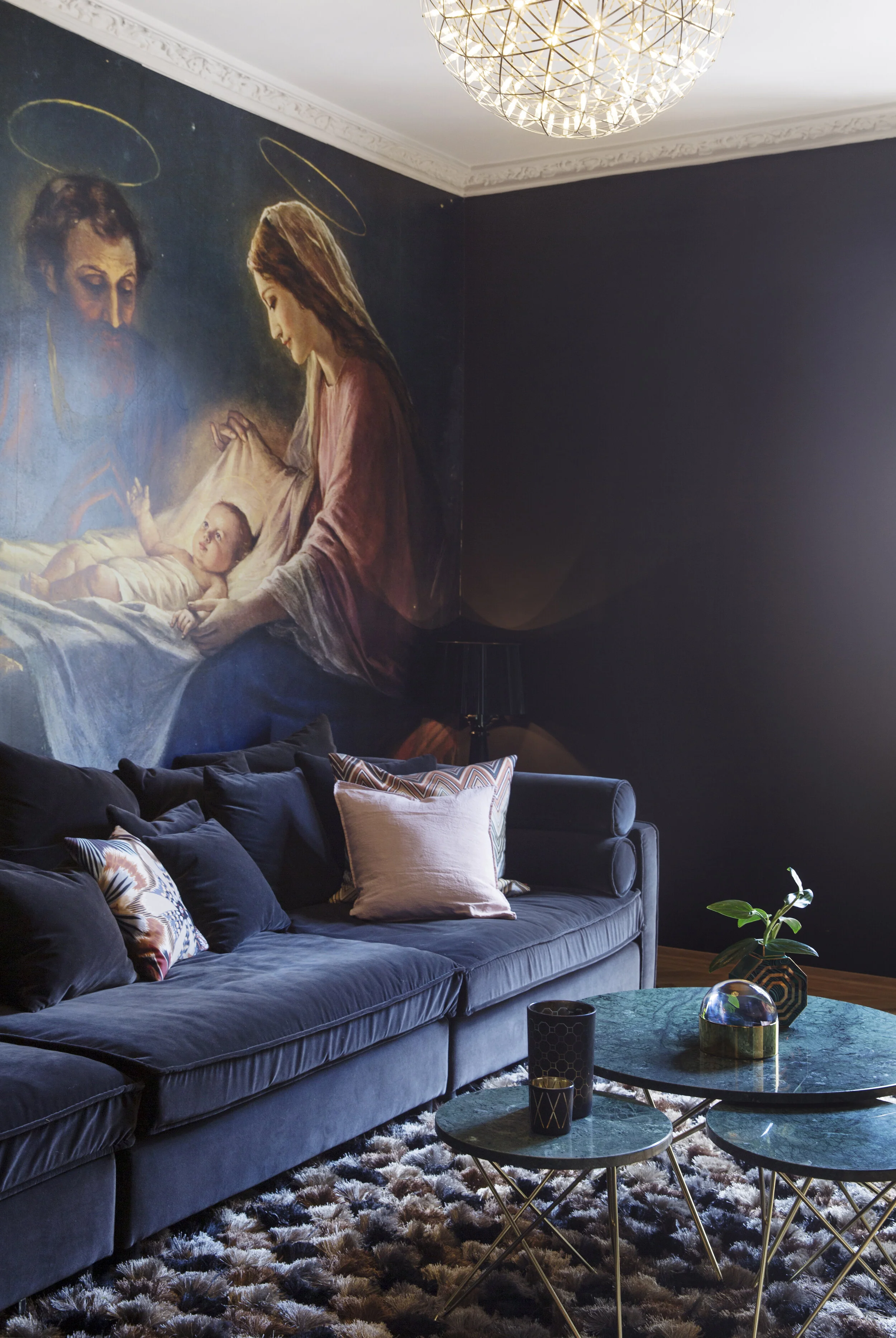 Det mest iøynefallende elementet må likevel være den tapetserte stueveggen, som skaper et dramatisk bakteppe for den åpne stue/kjøkkenløsningen.