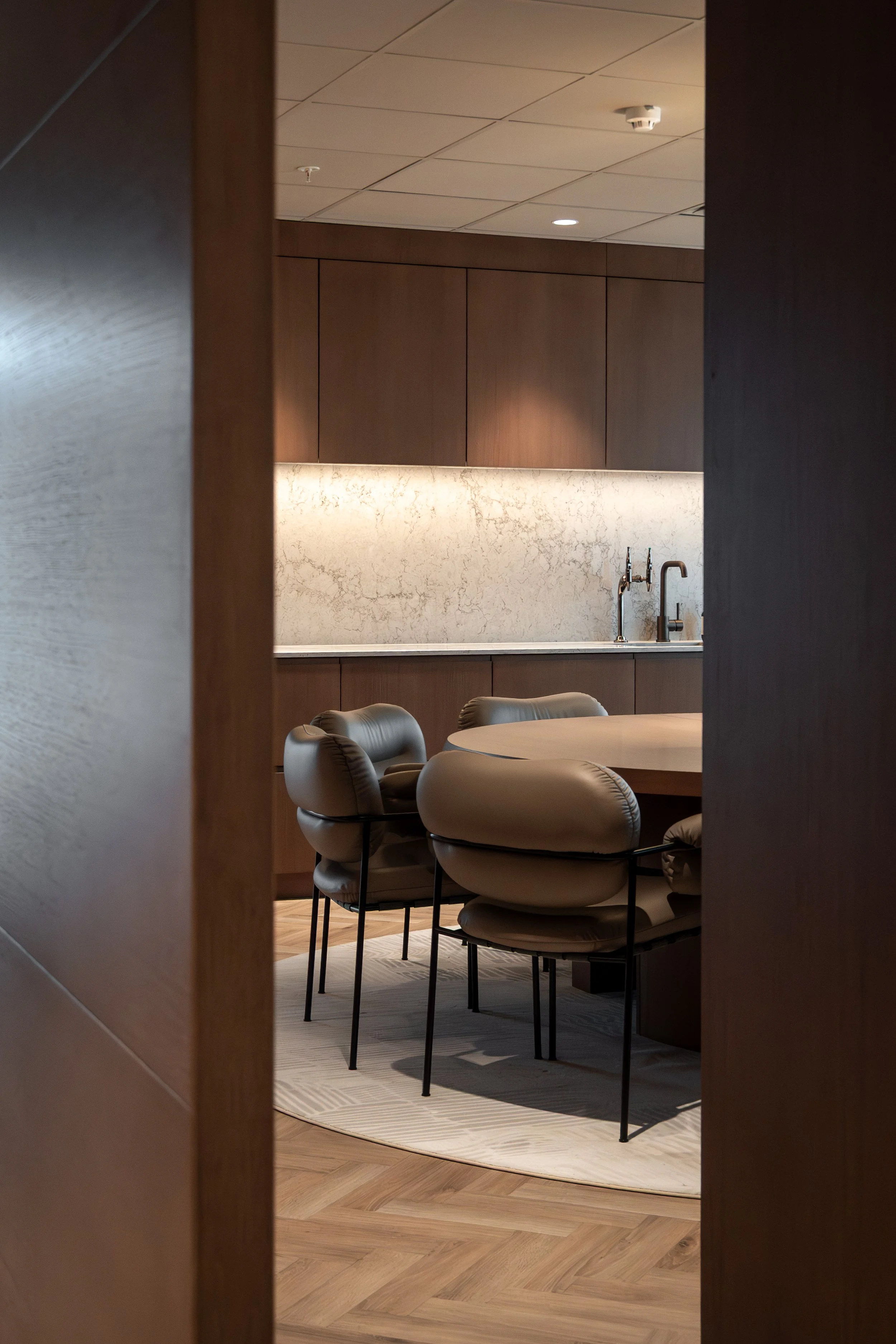 Velkomstsonen er utformet som et naturlig samlingspunkt, med et inviterende kjøkken og et stort, rundt bord som legger til rette for uformelle møter. De eksterne møterommene er også lagt til denne sonen. Dette arealet er adskilt fra arbeidssonen med en spesialtegnet pivotdør i samme finéroverflate som øvrig innredning – et karaktersterkt grep som understreker prosjektets helhetlige kvalitet.
