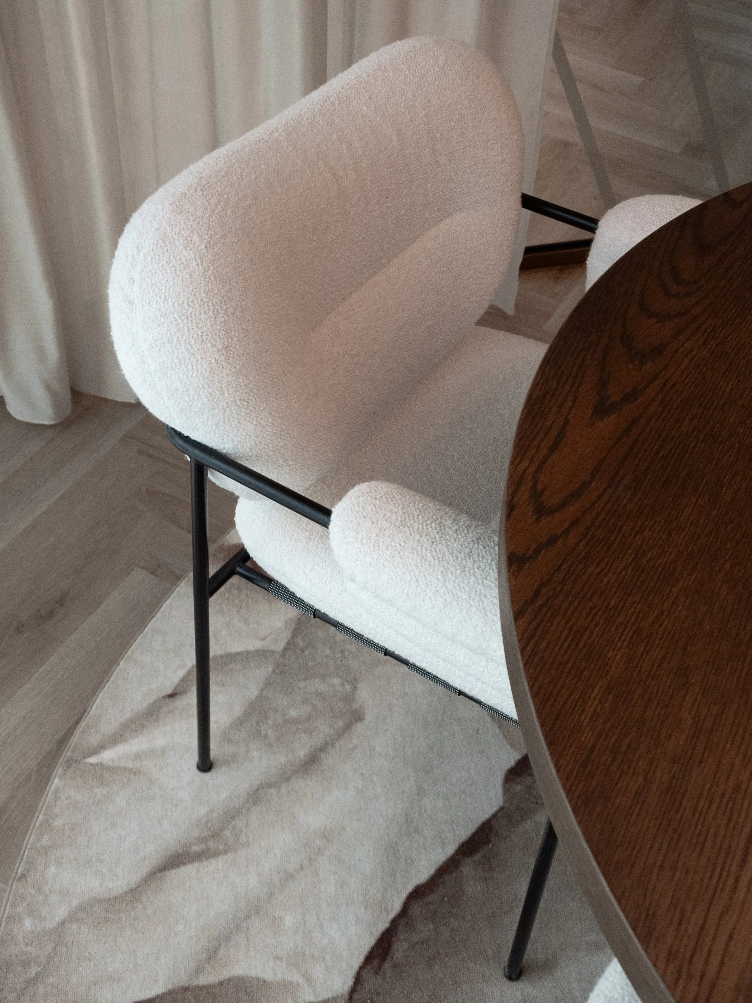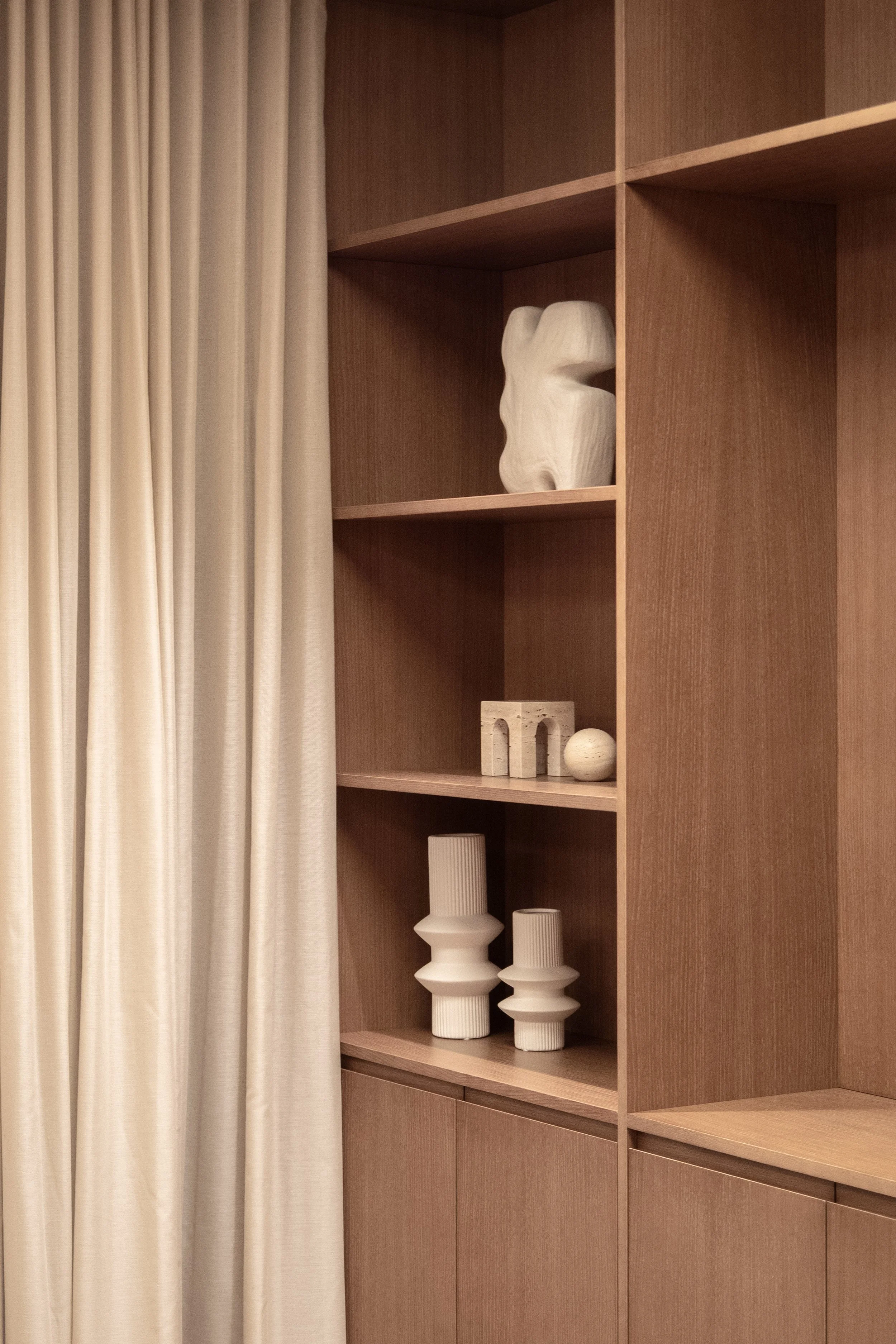 Interiøret er utformet med mørk trefinér som bærende base, kombinert med dempede beige nyanser som går ton-i-ton gjennom hele prosjektet. Resultatet er sofistikert og elegant.