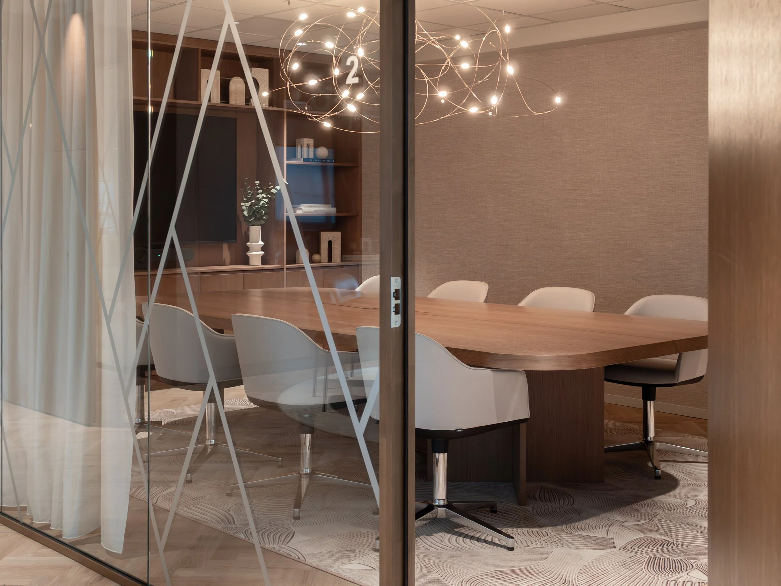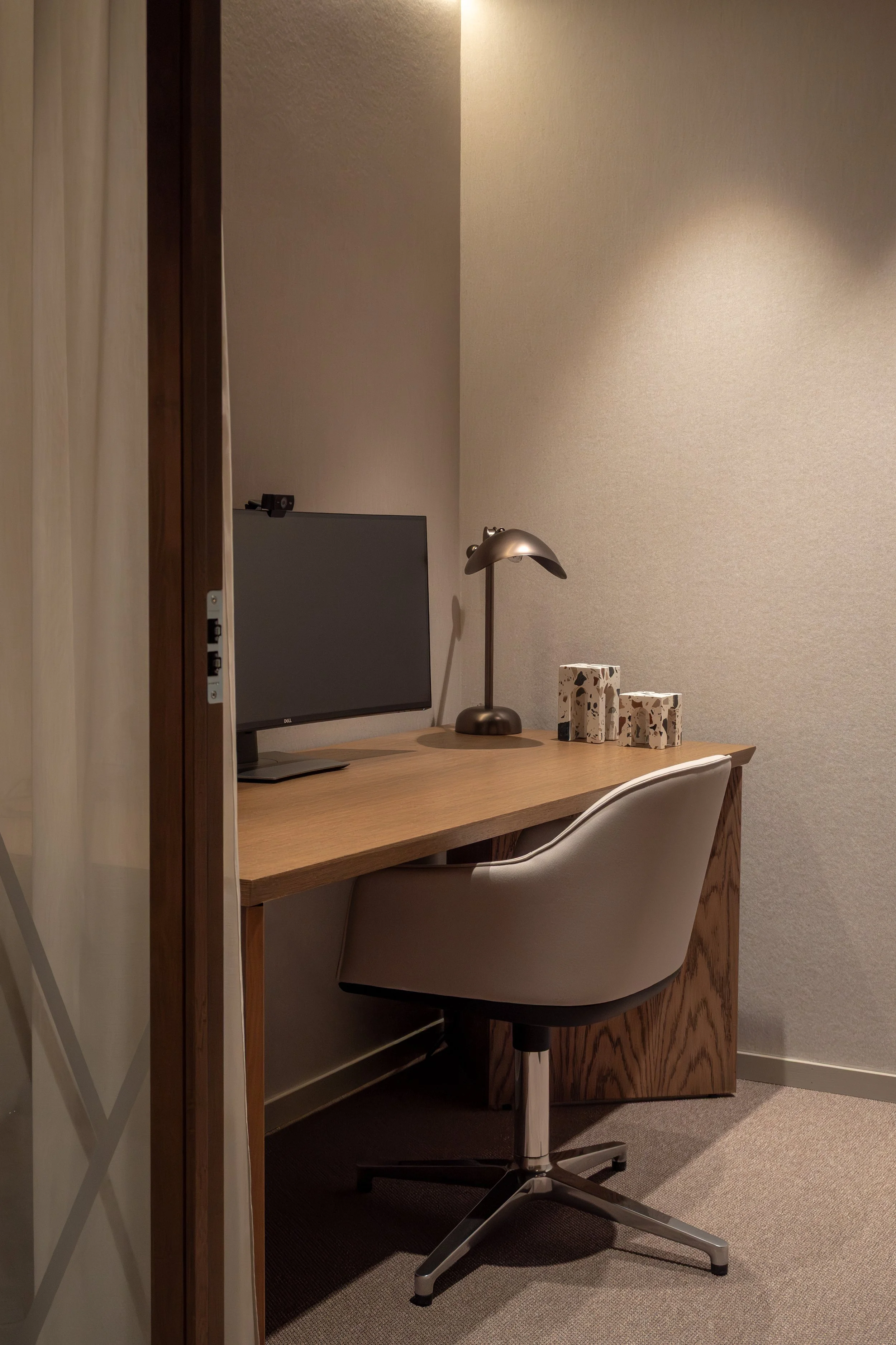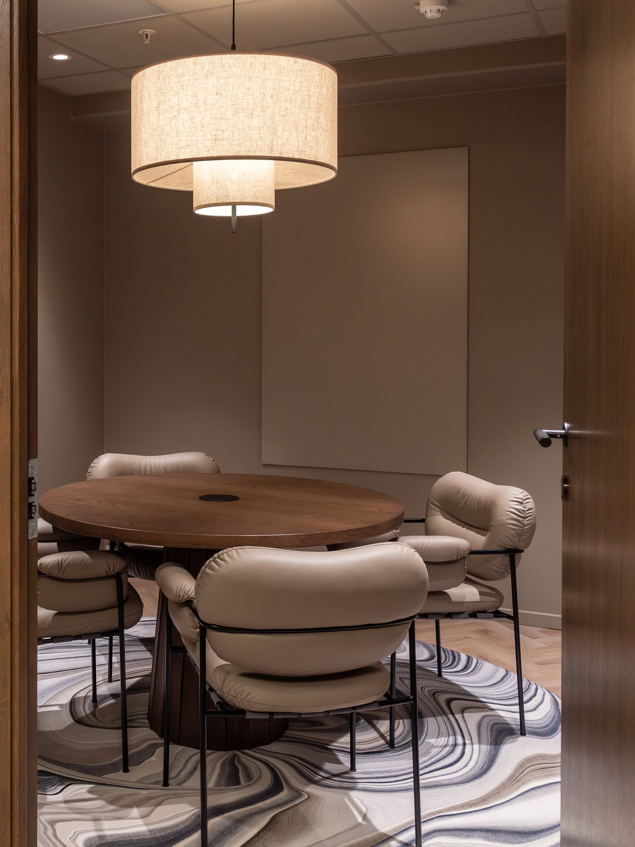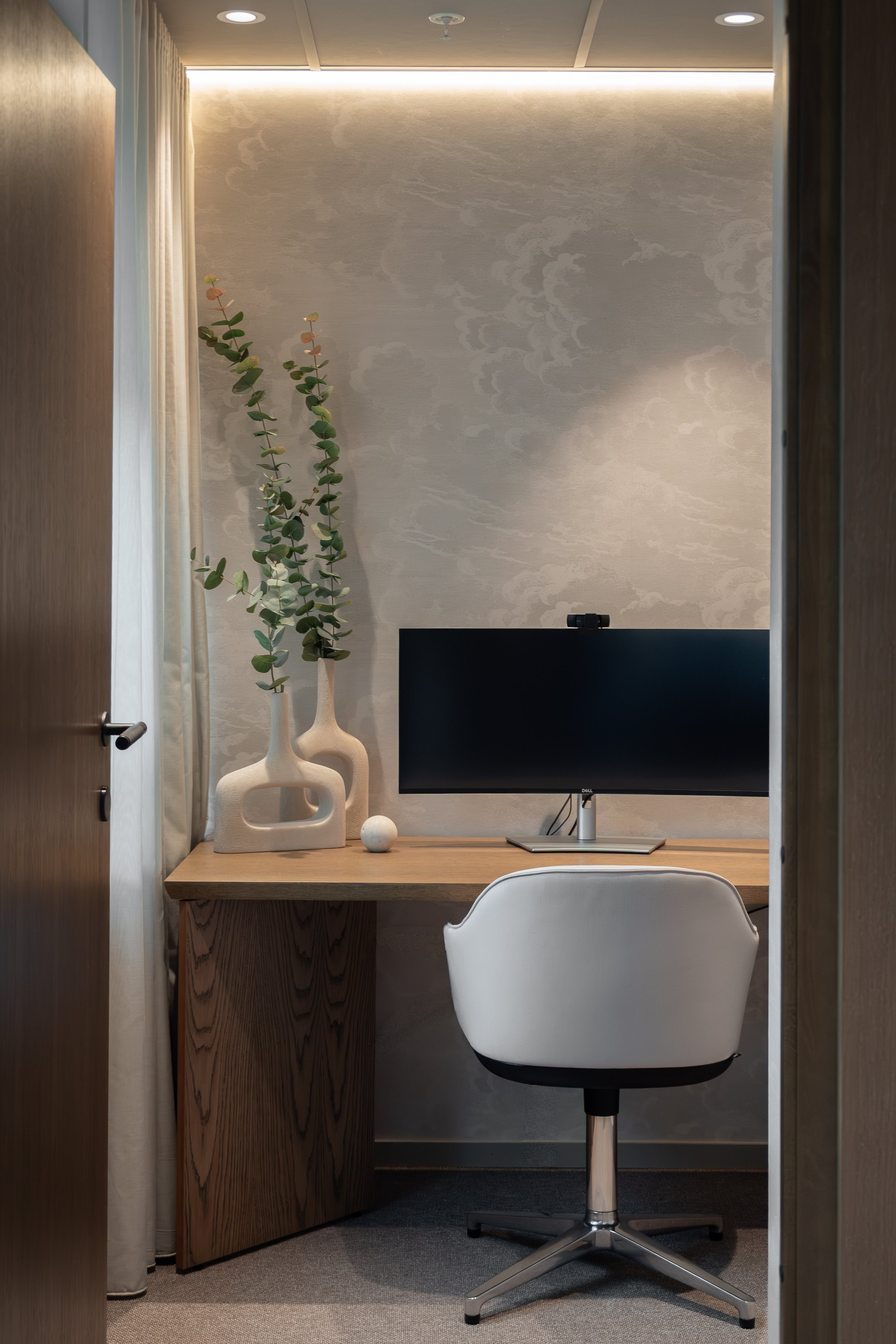 Tekstiler, tapeter og nøye utvalgte dekorlamper tilfører dybde og taktilitet, og bidrar til en lun atmosfære som balanserer det profesjonelle med det inviterende. Kontoret er designet for å støtte både konsentrasjon og fellesskap – med soner som tydelig definerer ulike funksjoner uten å bryte helheten.