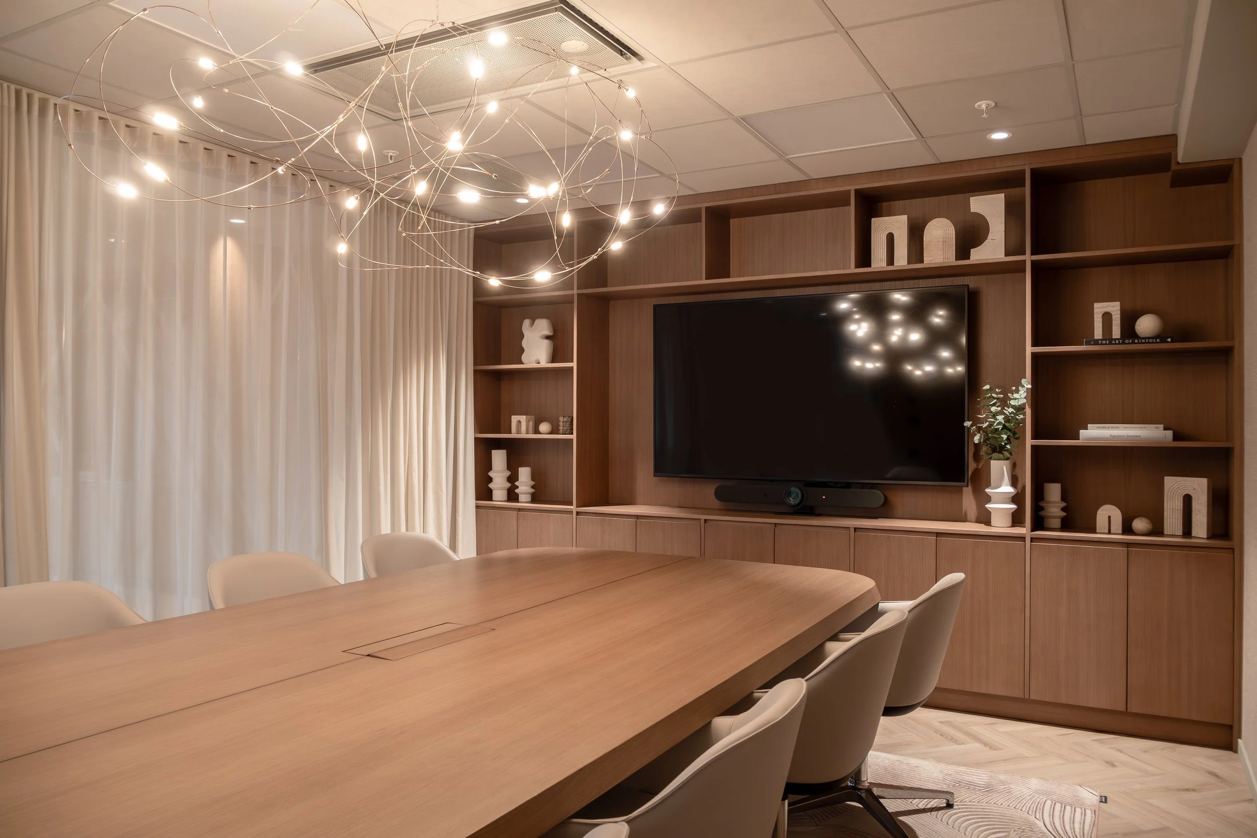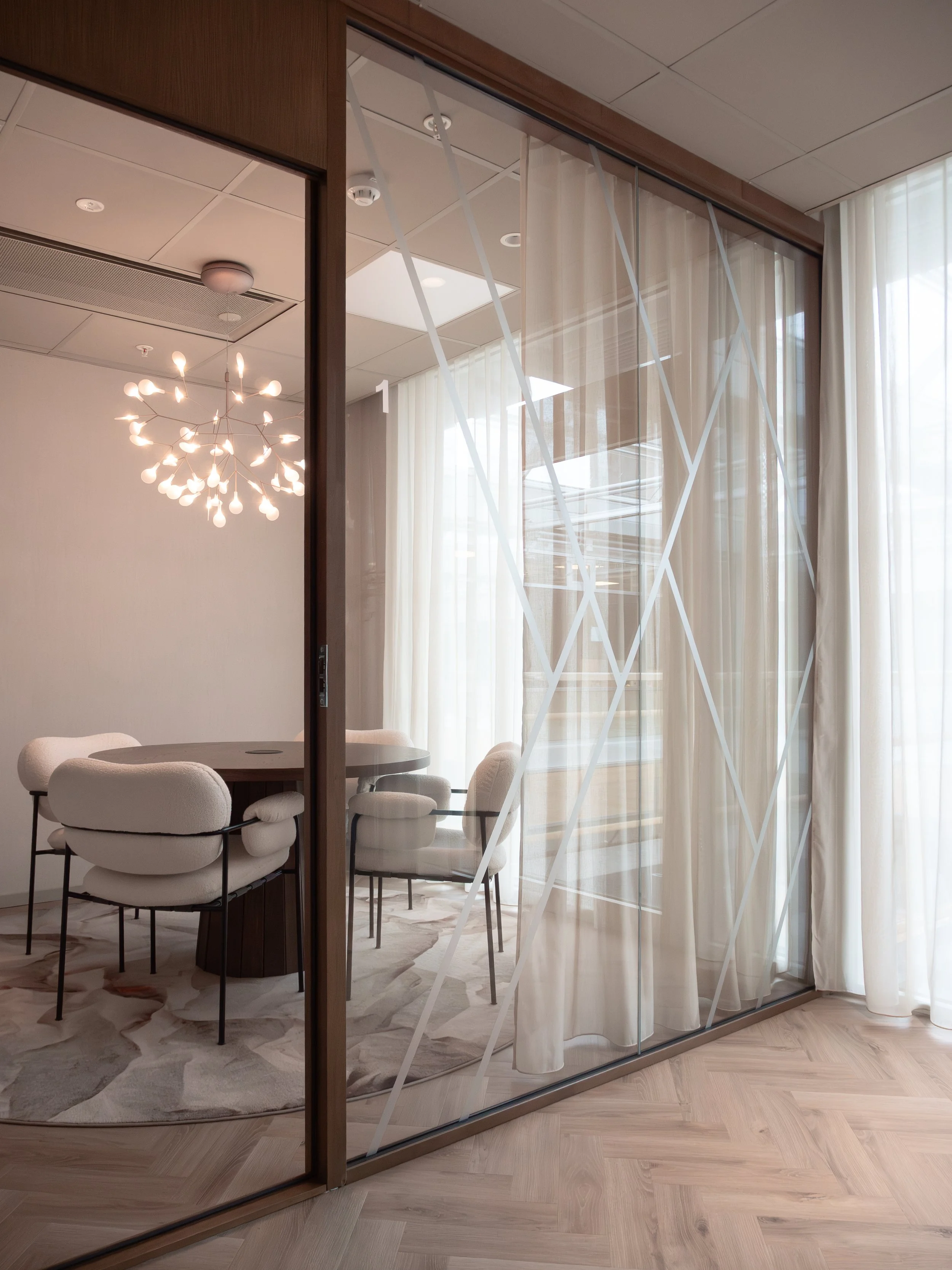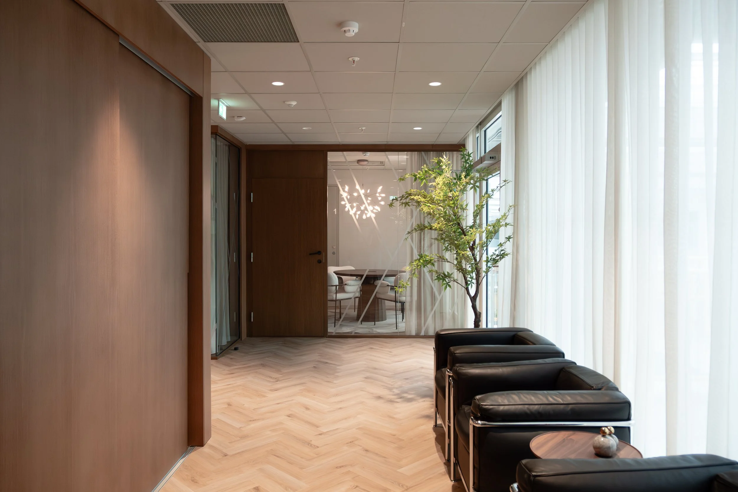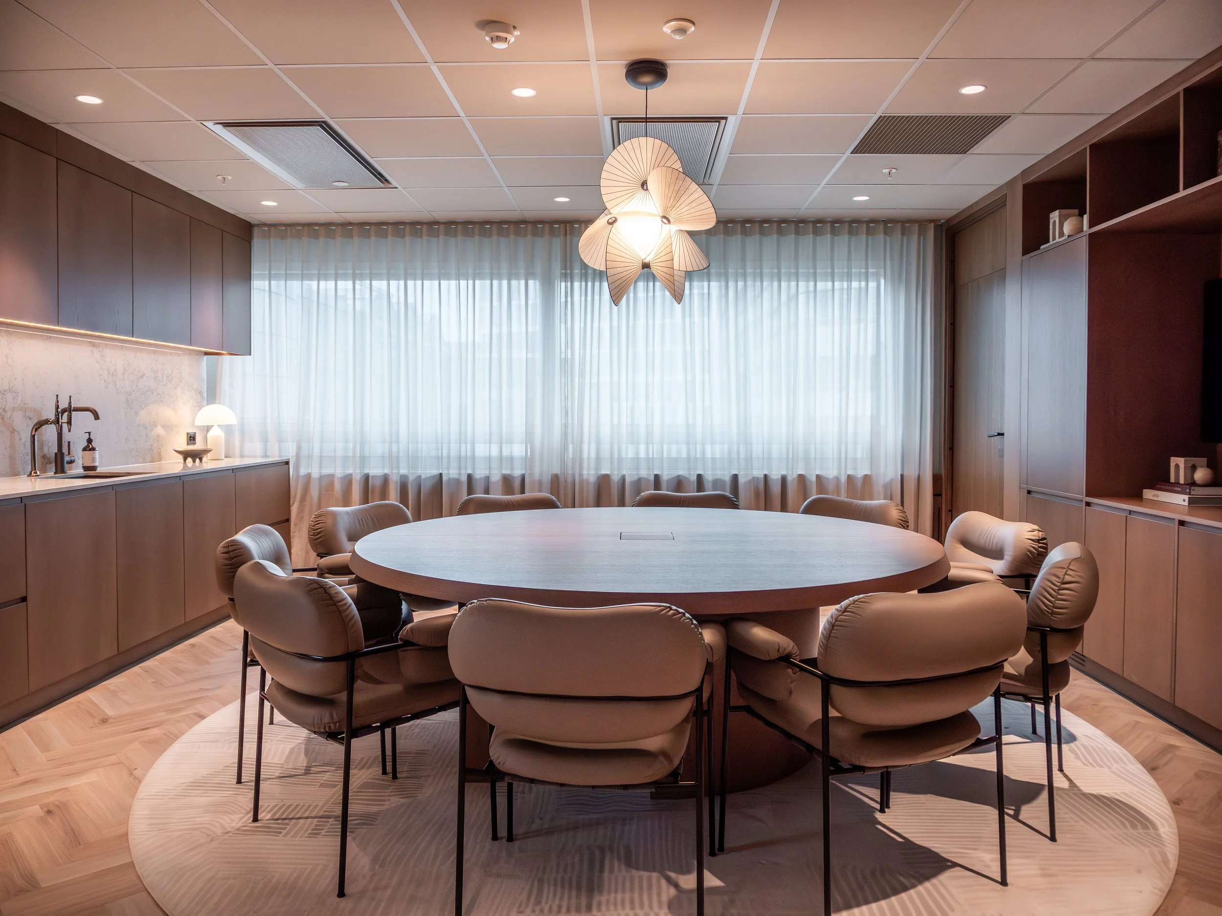 Tekstiler, tapeter og nøye utvalgte dekorlamper tilfører dybde og taktilitet, og bidrar til en lun atmosfære som balanserer det profesjonelle med det inviterende. Kontoret er designet for å støtte både konsentrasjon og fellesskap – med soner som tydelig definerer ulike funksjoner uten å bryte helheten.